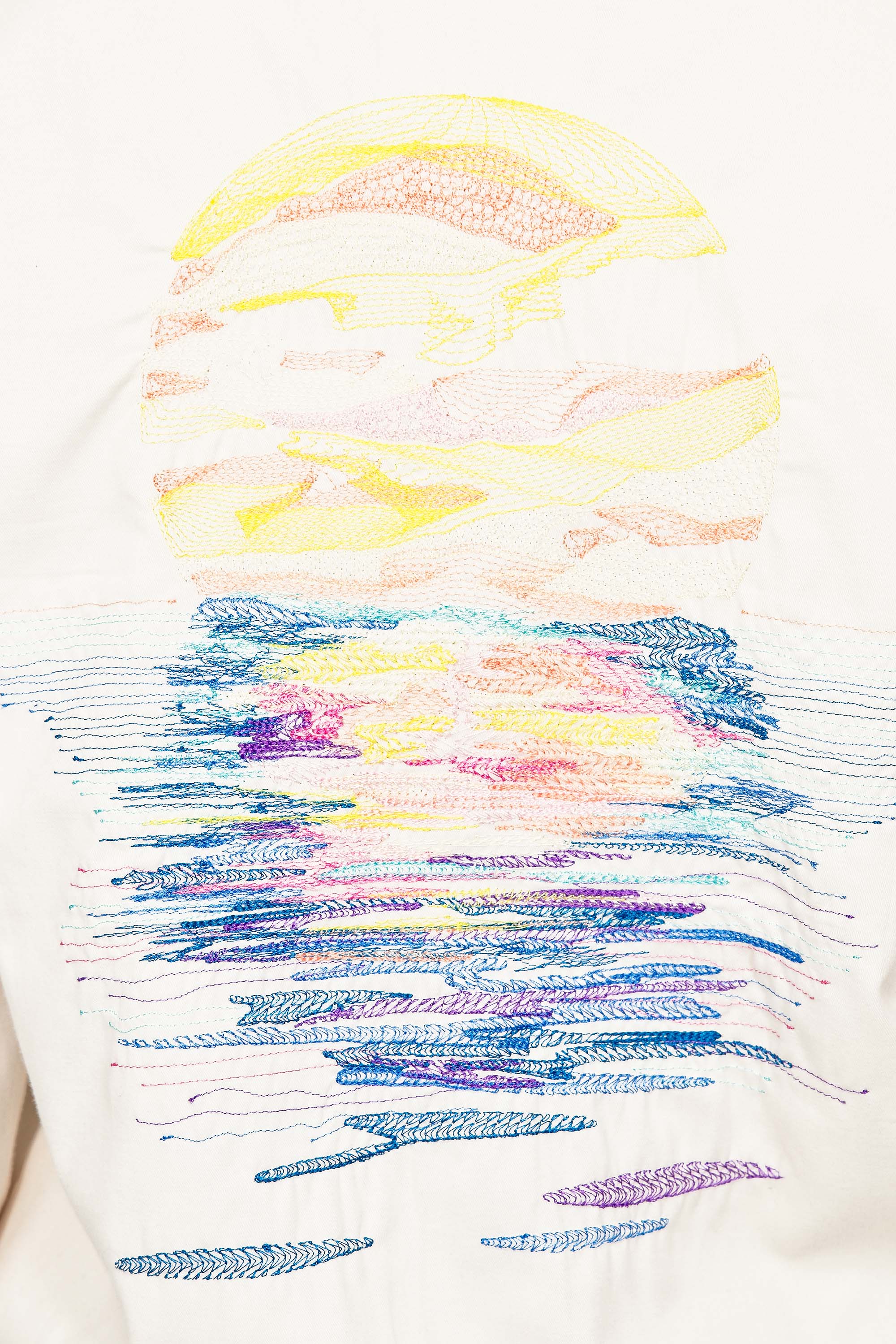 La méditation des journées estivales, s'exprime ici, avec douceur, par notre broderie "coucher de soleil". Le soleil, source de vie, puissance créatrice, astre du jour et de la lumière qu'on ne cesse d'admirer, comme un réservoir d'énergie vitale, et de chaleur. Une force régénératrice autant qu'apaisante.