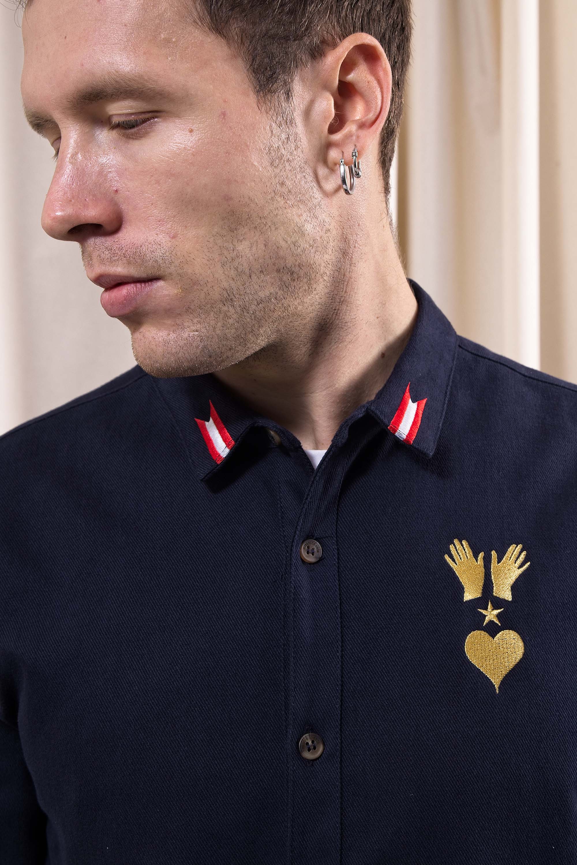 La Surchemise Fontanero est l'une des pièces phare de cette collection, on y retrouve tous les codes de la marque jusqu'à son symbole, représentant le travail de nos couturiers: « Manos, Espíritu y Corazón », car nous travaillons avec nos mains, notre esprit et notre coeur.