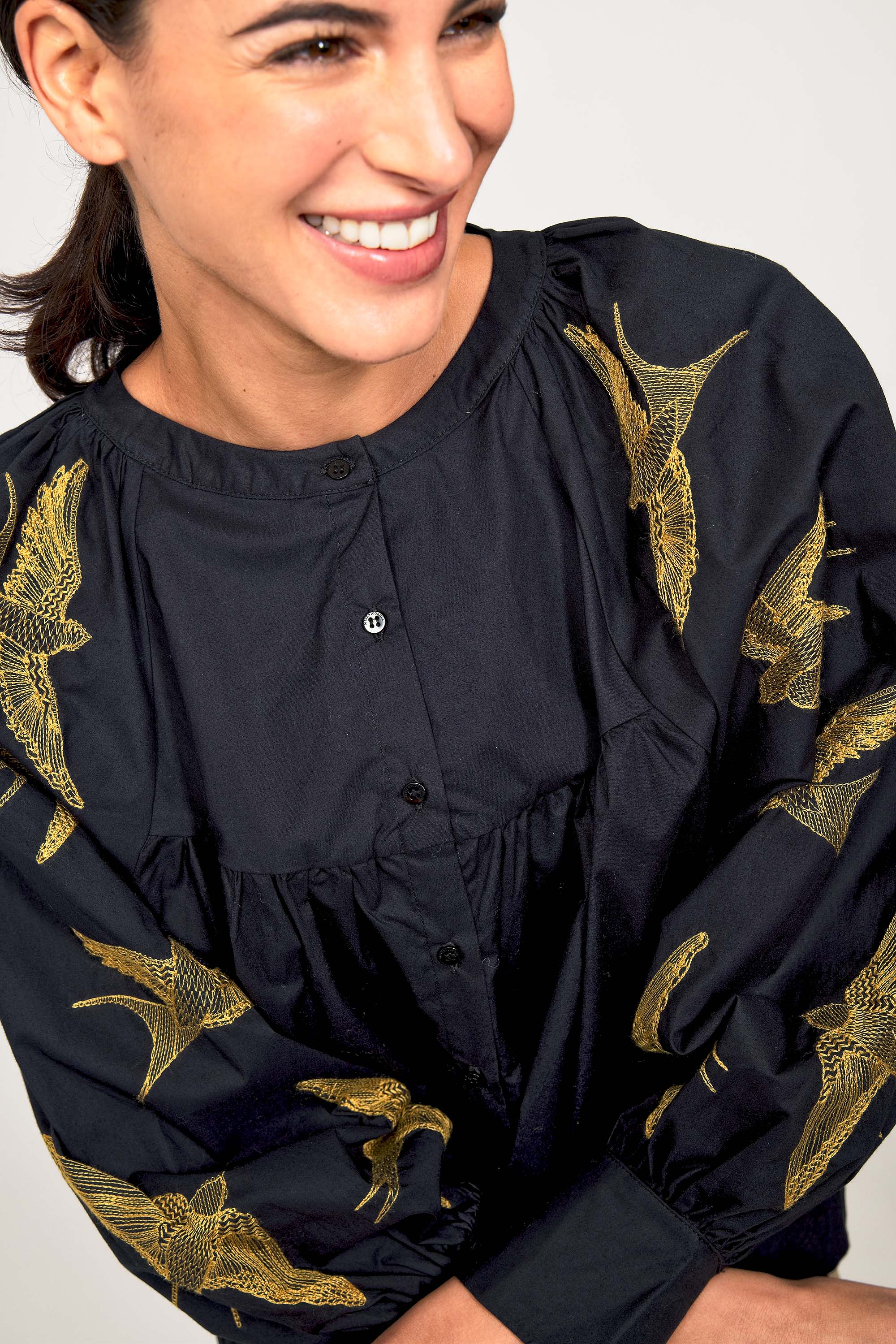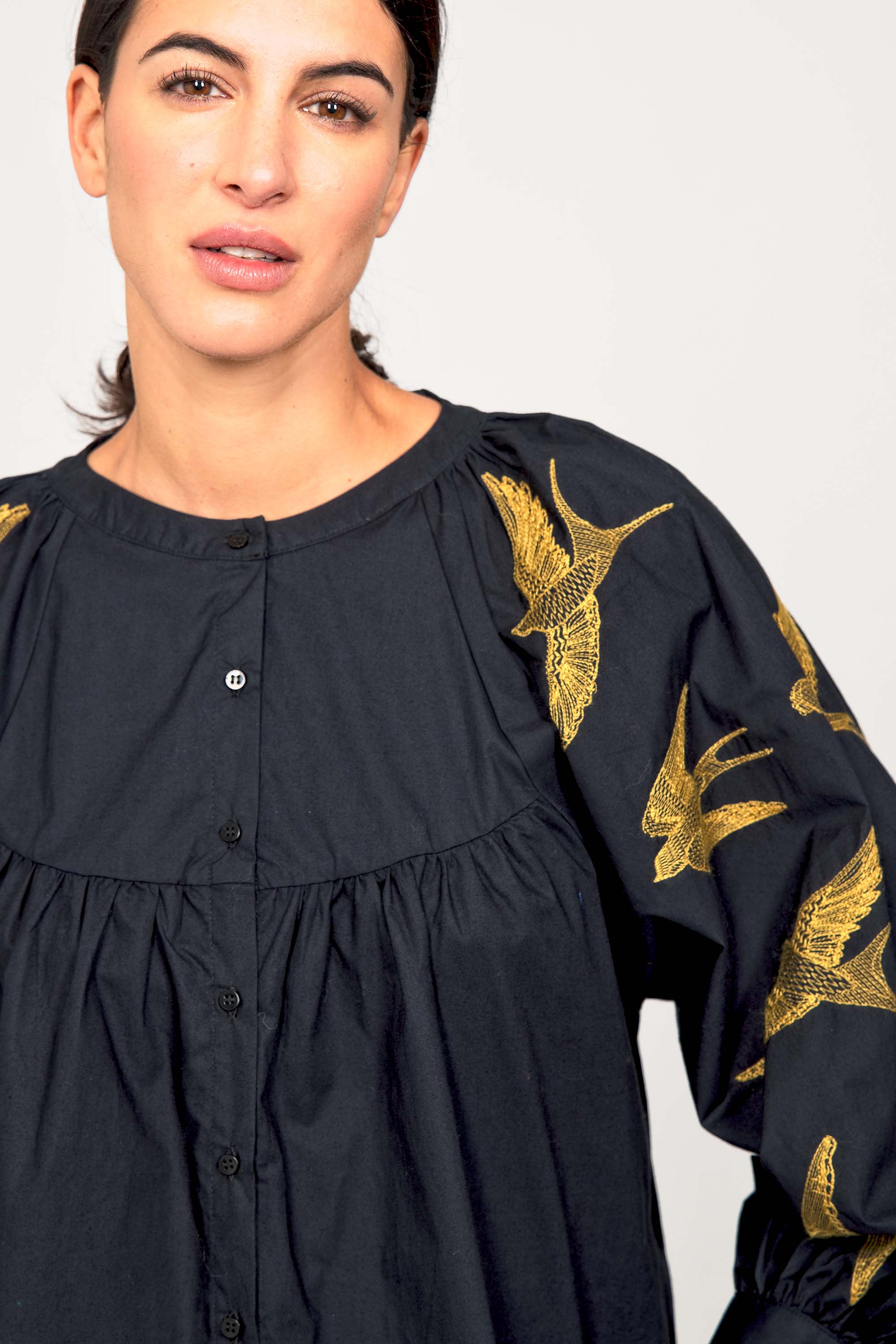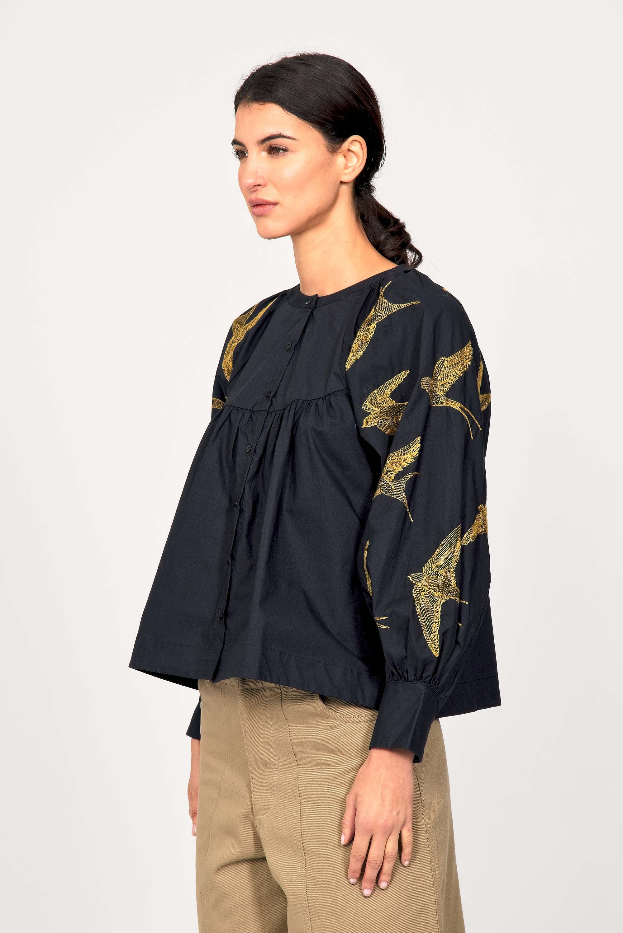 BLACK COTTON SHIRT WITH BIRDS EMBROIDERY ON THE ARMS, LOOSE FIT