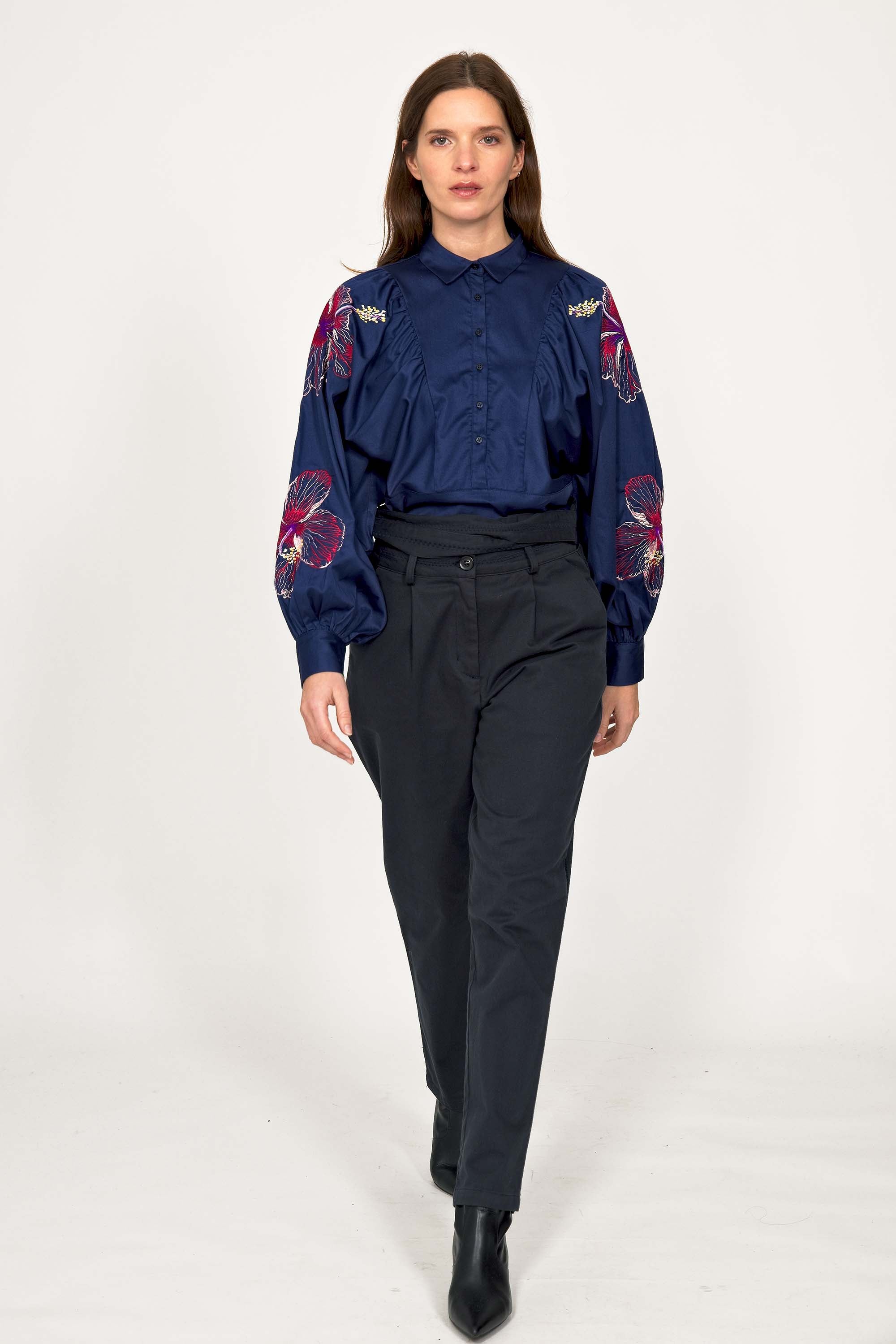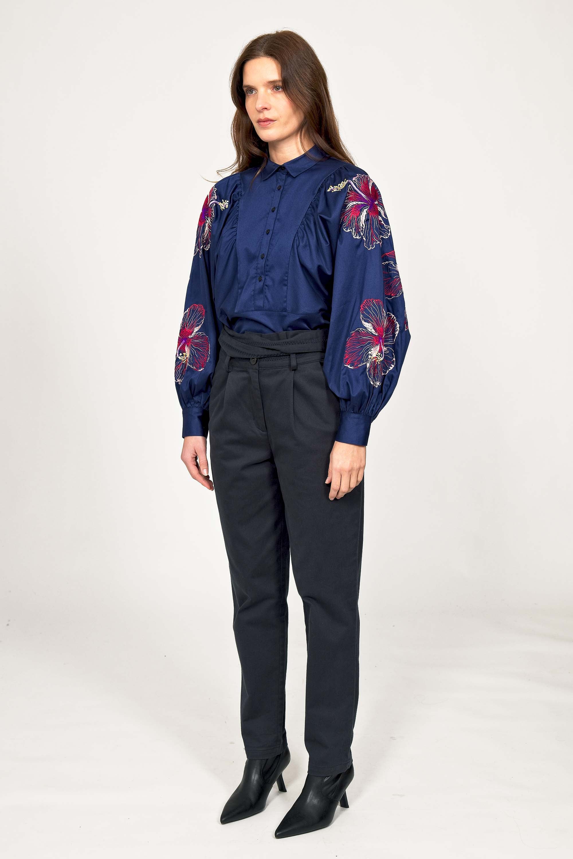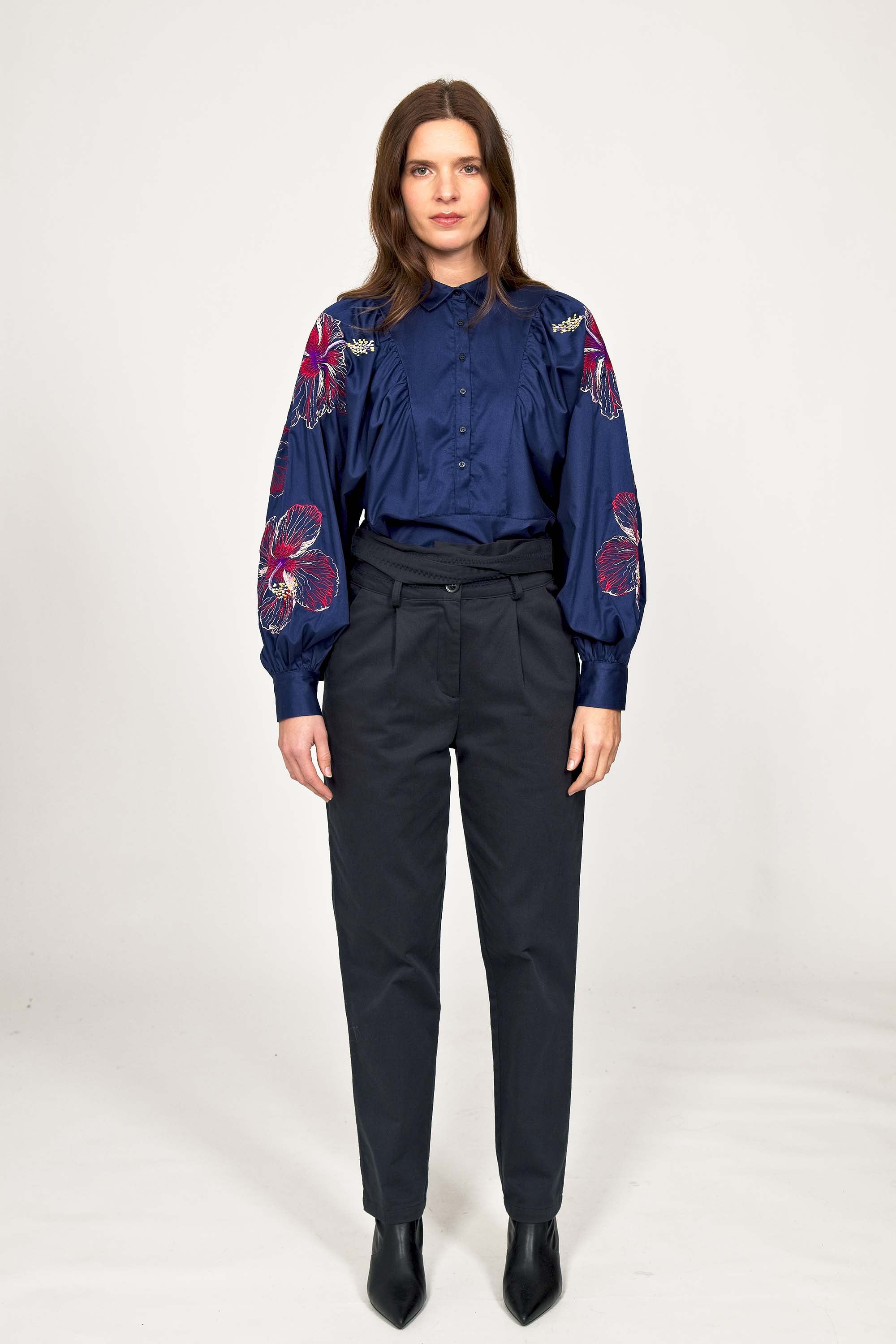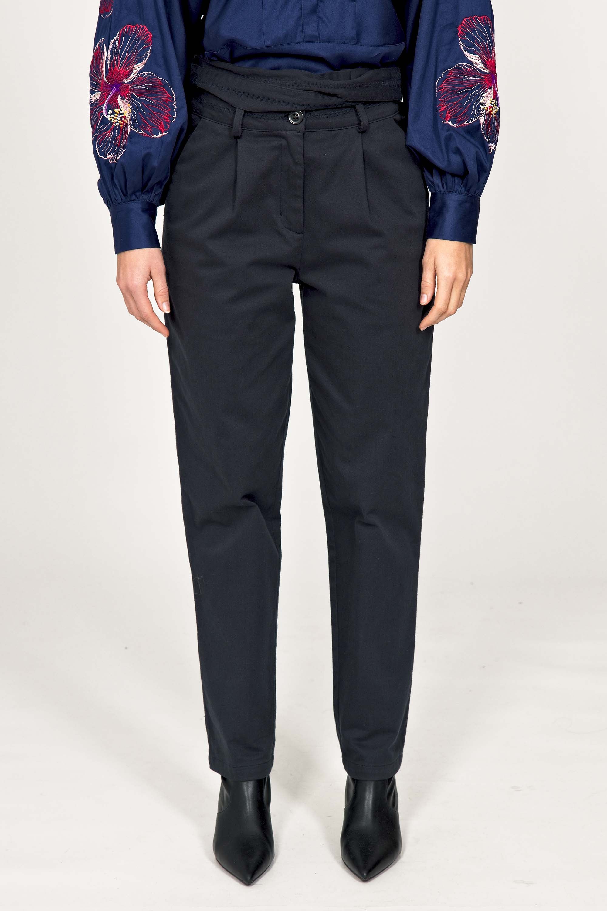 These pants are both feminine and casual . A high waist, fitted at the hips, which falls on the leg straight, slightly tightened at the ankle. This model will be the ideal companion for your wardrobe. We'll love wearing it with loose bloused tops inside.