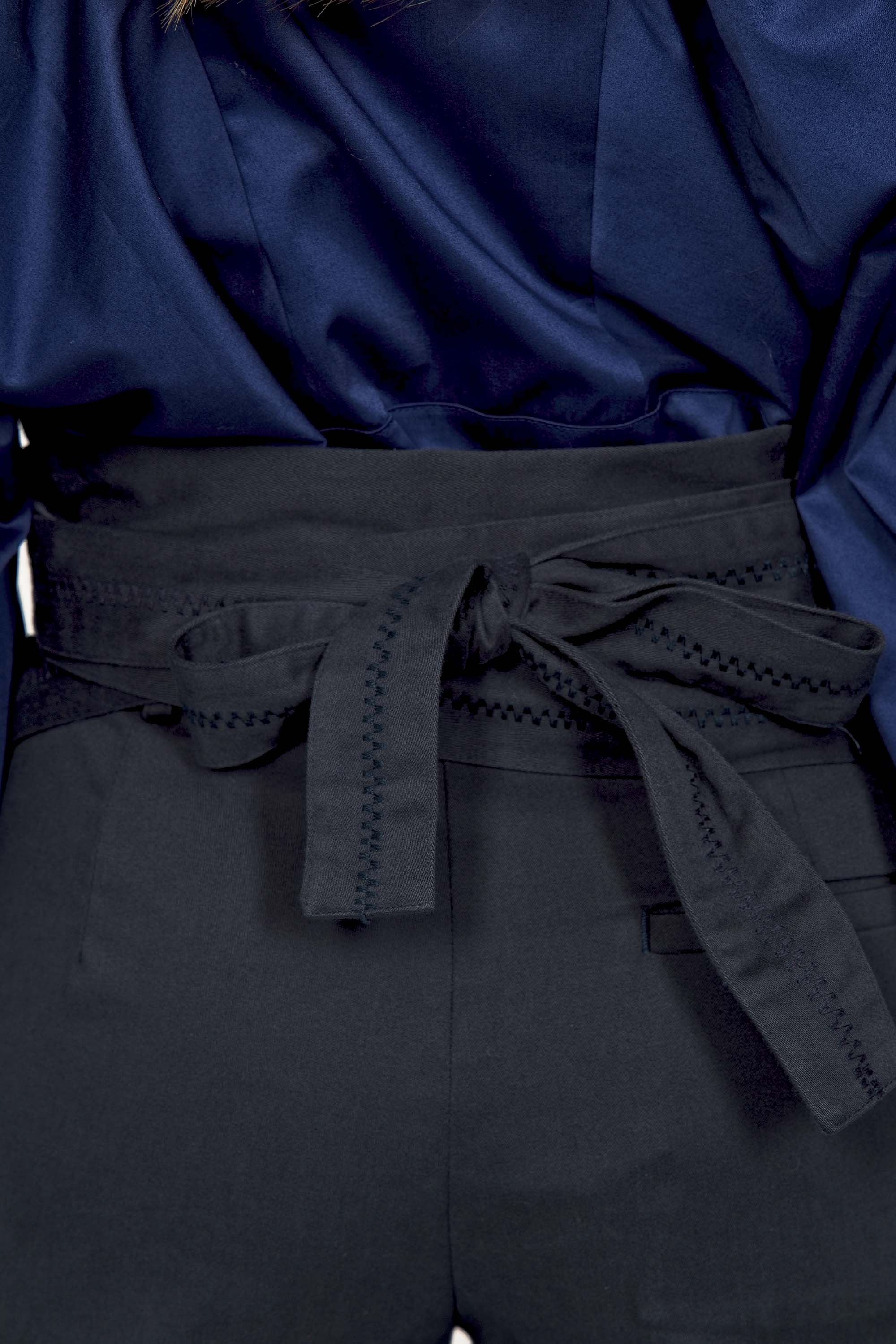 A fatal cut to finish your look in style. The belt attached to the sides will create the center of attention. The comfortable cut and its back pocket imitating suit pants make them terribly modern pants .
