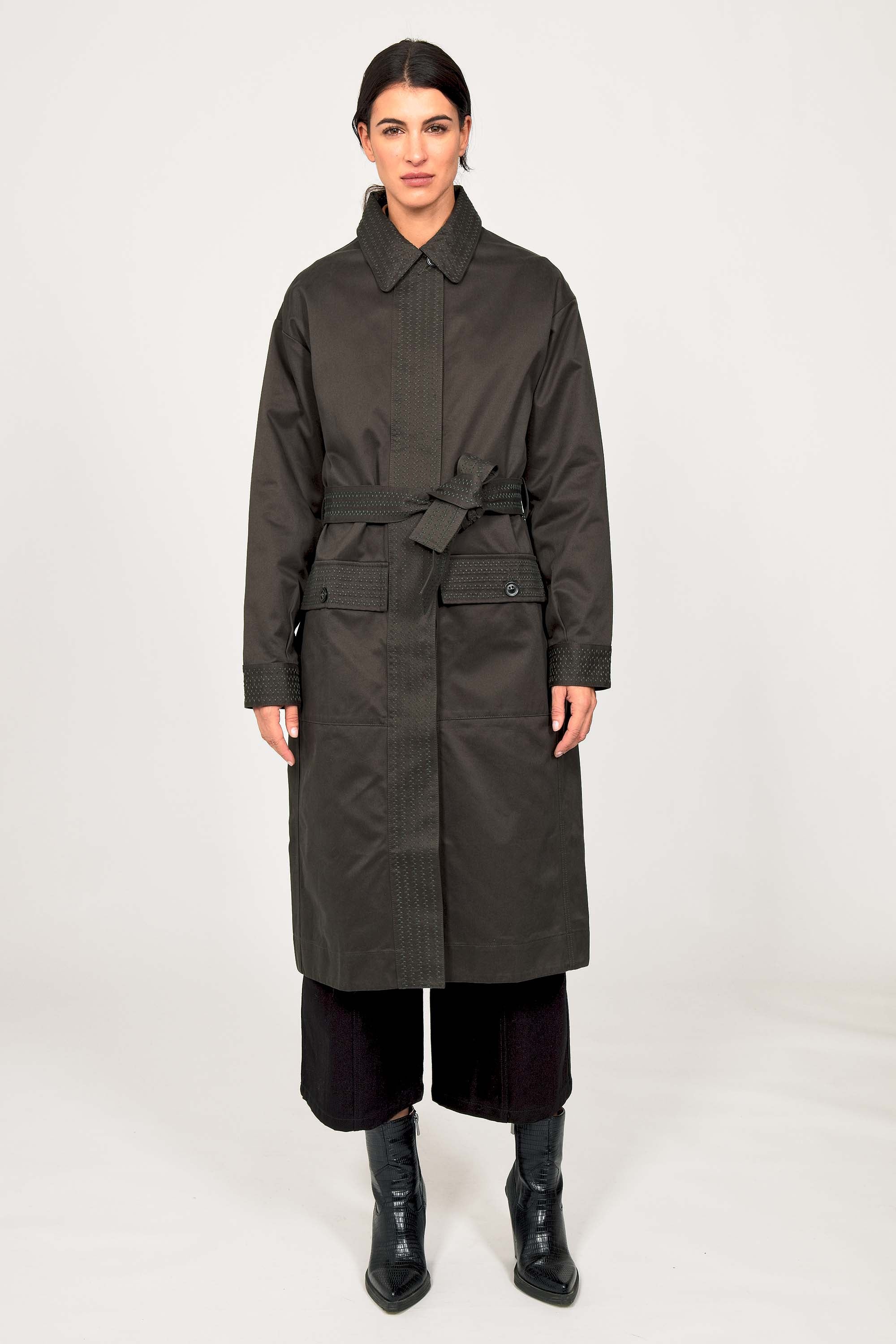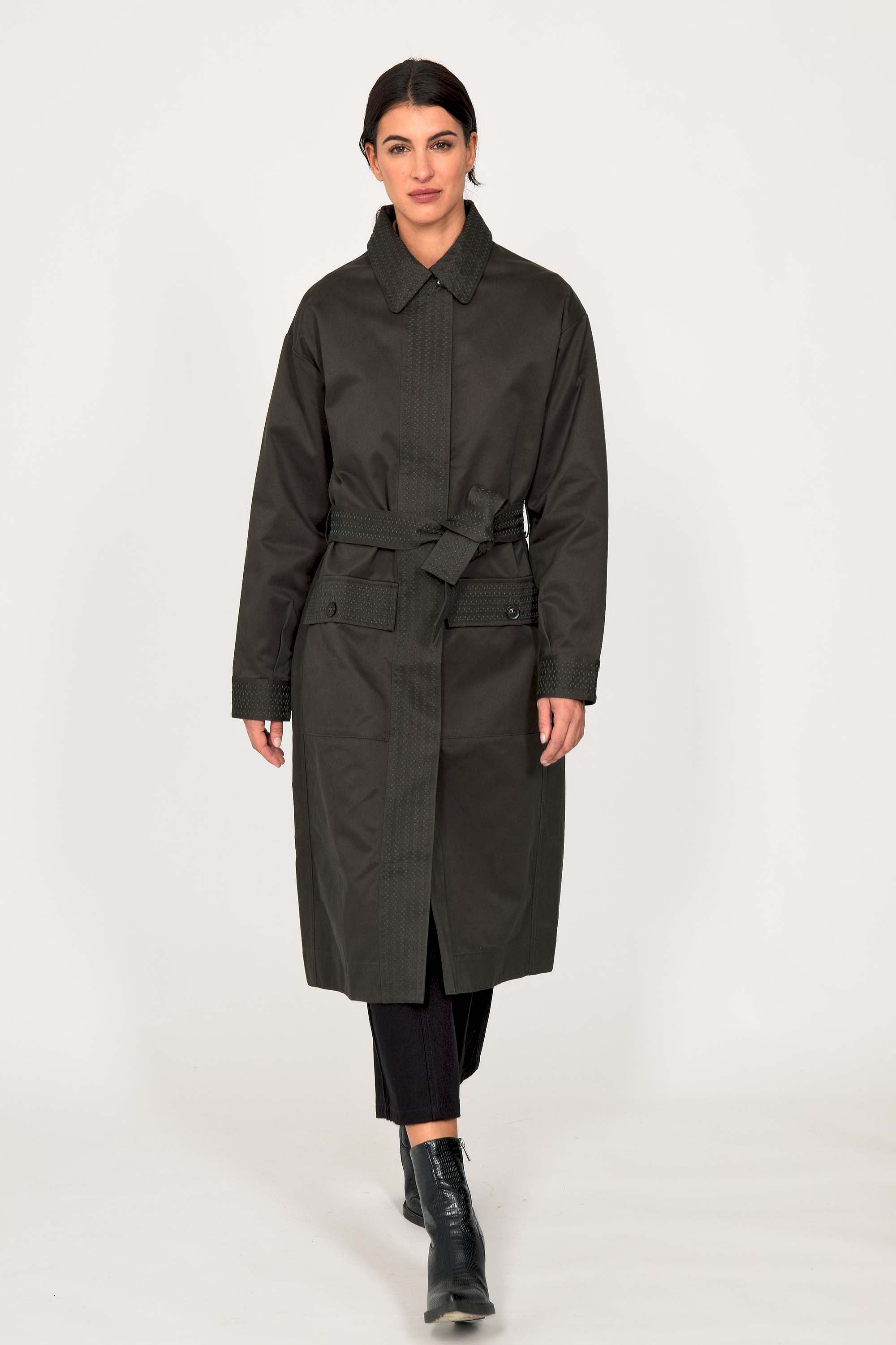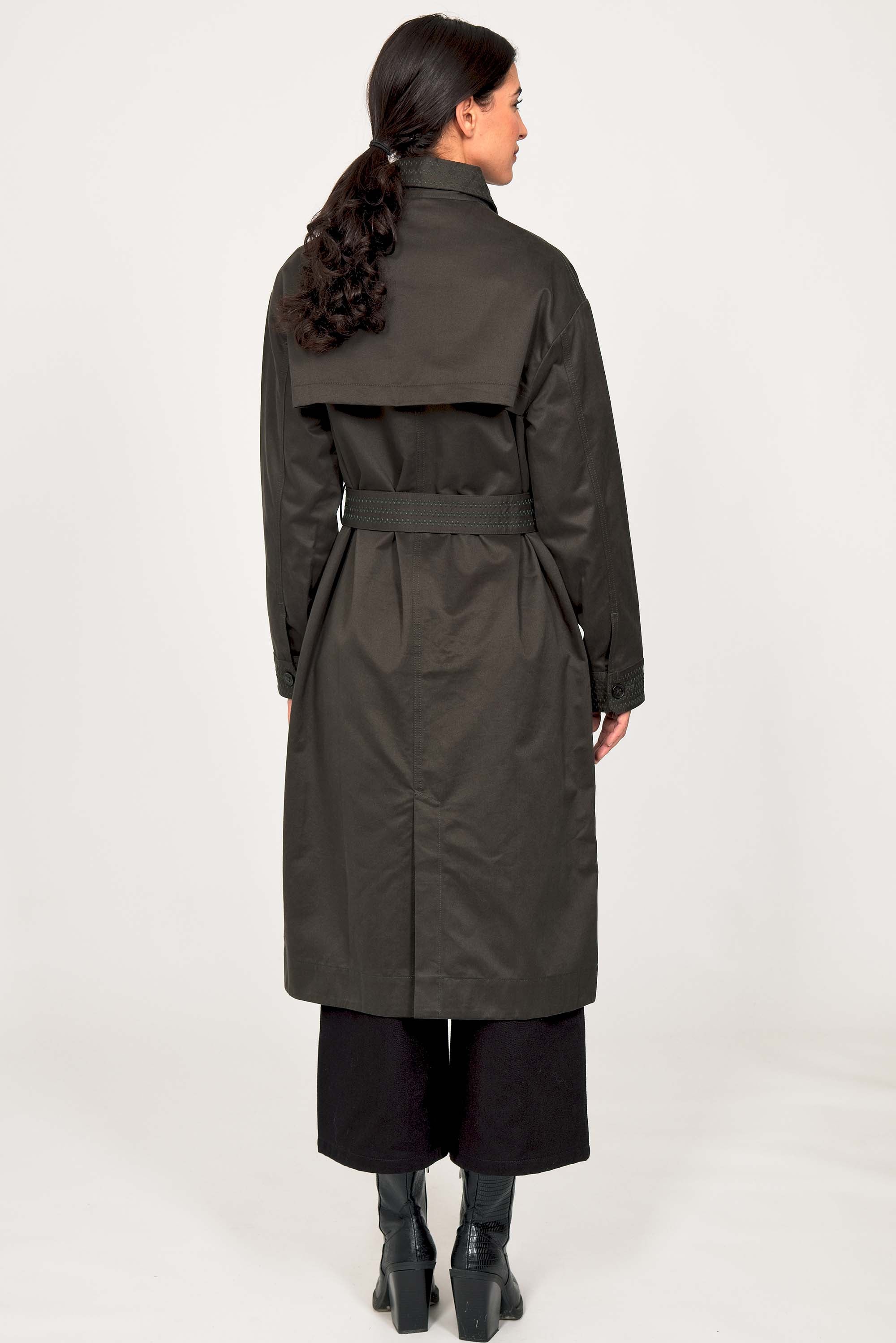 Our trench coat embodies all the classic elements: a back pleat for ease of movement, fitted cuffs, symmetrical buttoning, and large pockets . Its longer length makes it an essential jacket for the mid-season, while its concealed button placket perfectly creates a chic look. A true timeless classic and a valuable ally on gloomy days and during unpredictable weather.