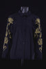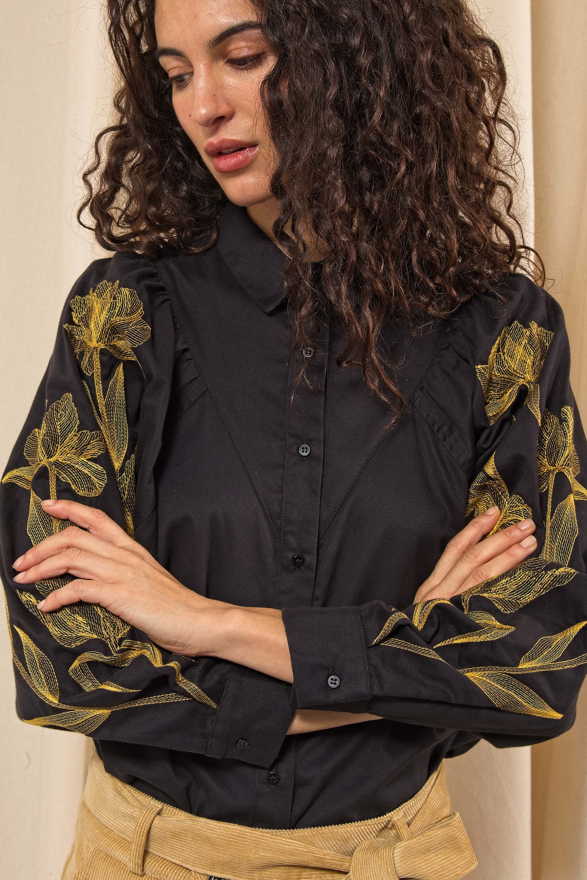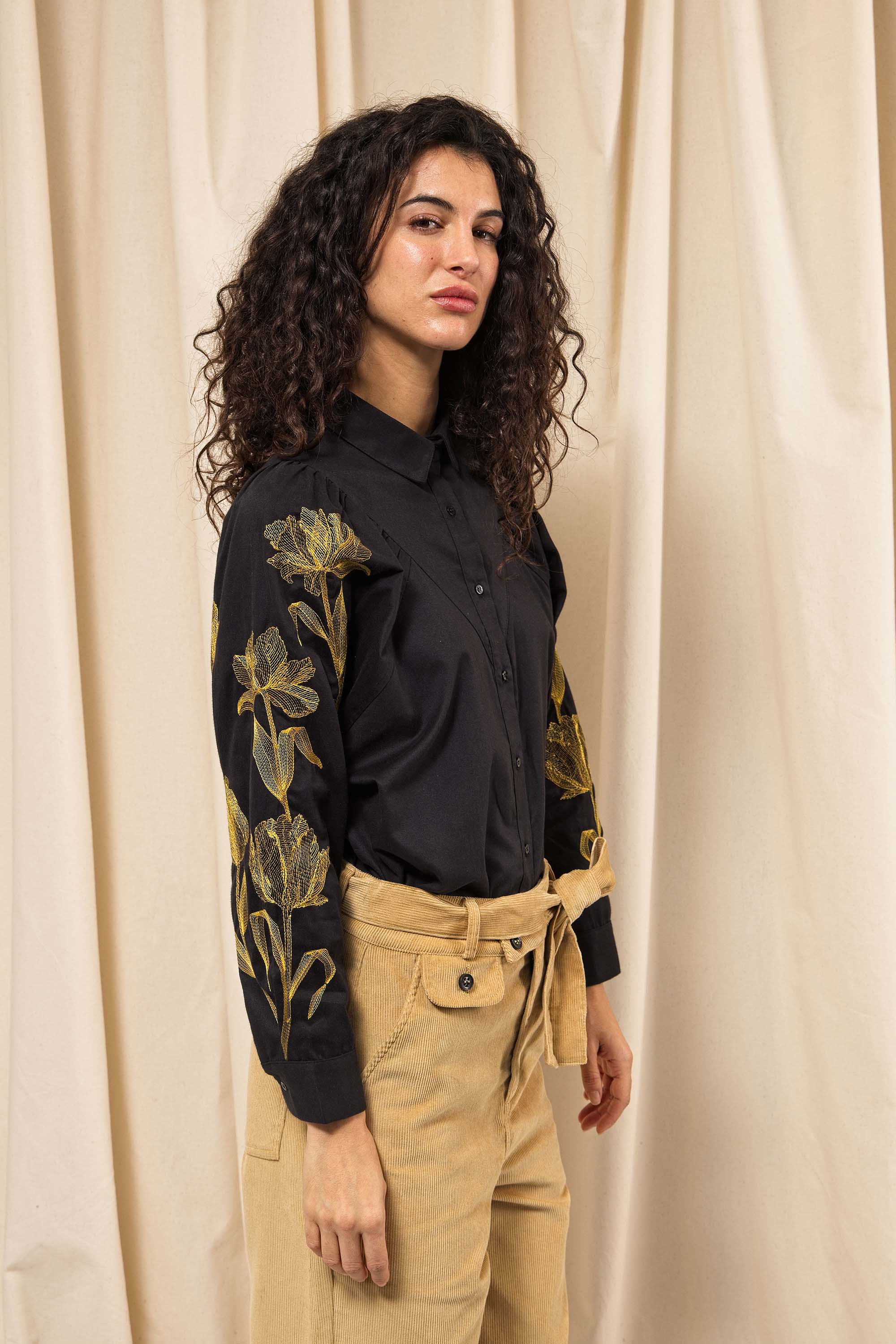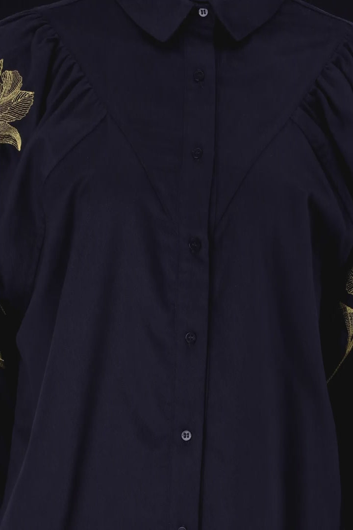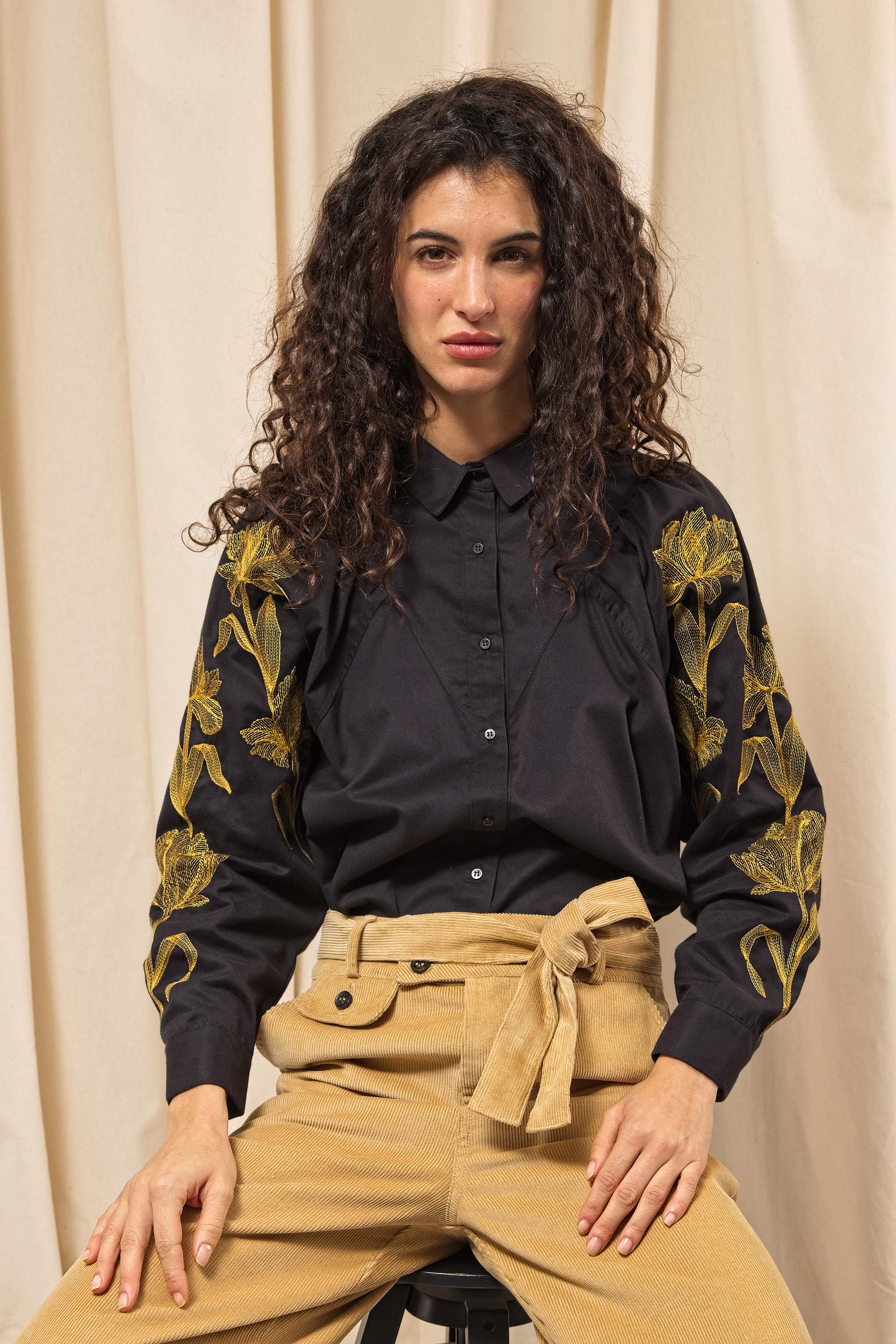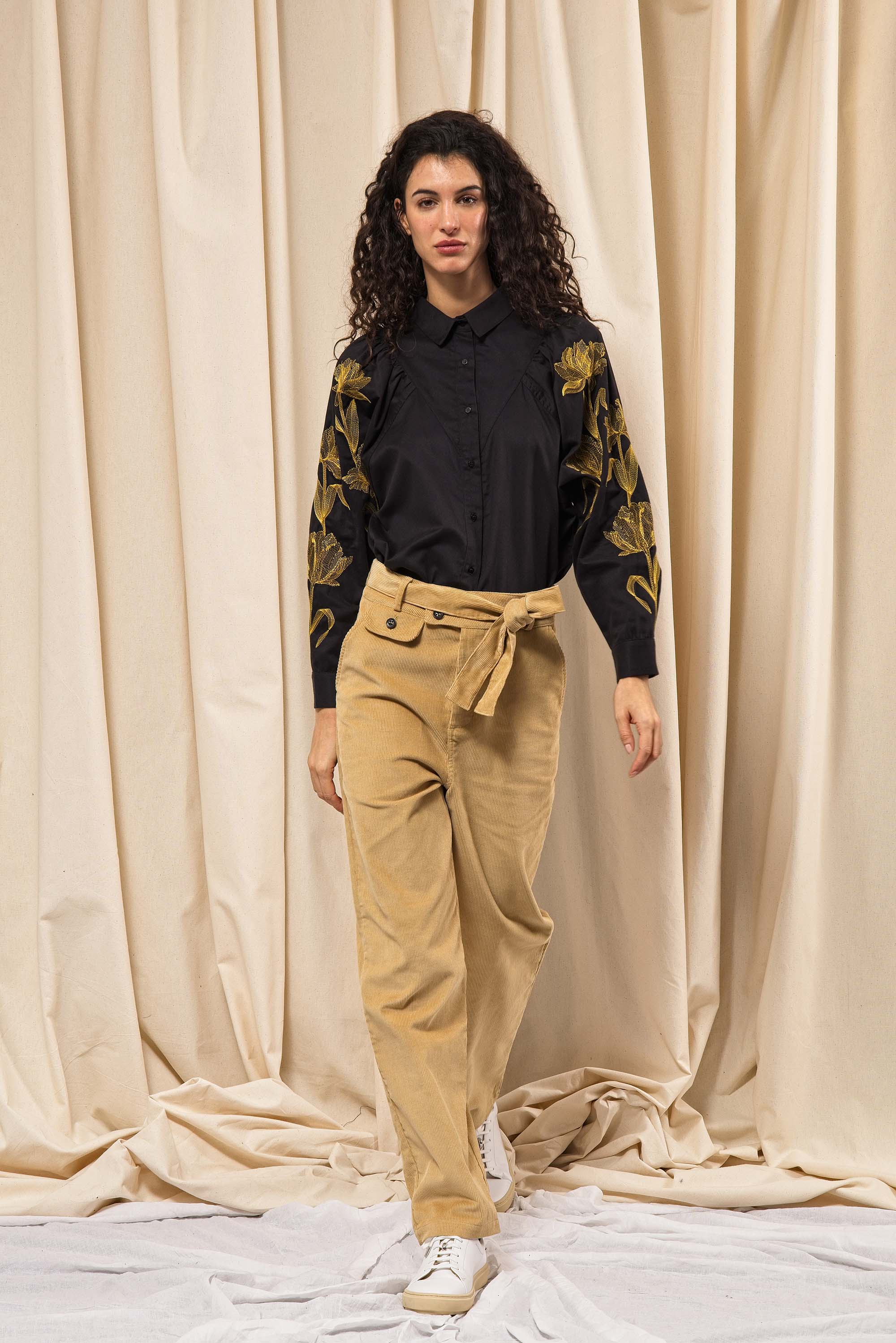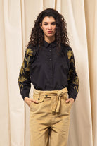 BLACK SHIRT WITH FLORAL EMBROIDERY AND BUTTONED BIB EFFECT