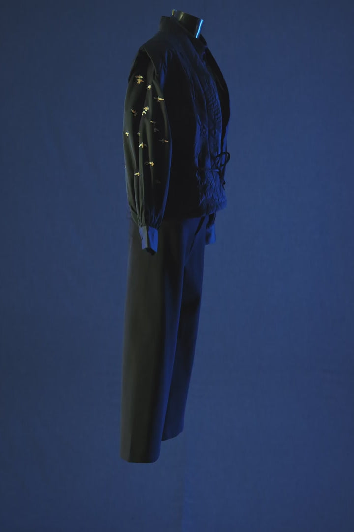 BLACK BUTTONED BUTTONED BALLOON SLEEVE SHIRT WITH BIRDS EMBROIDERED