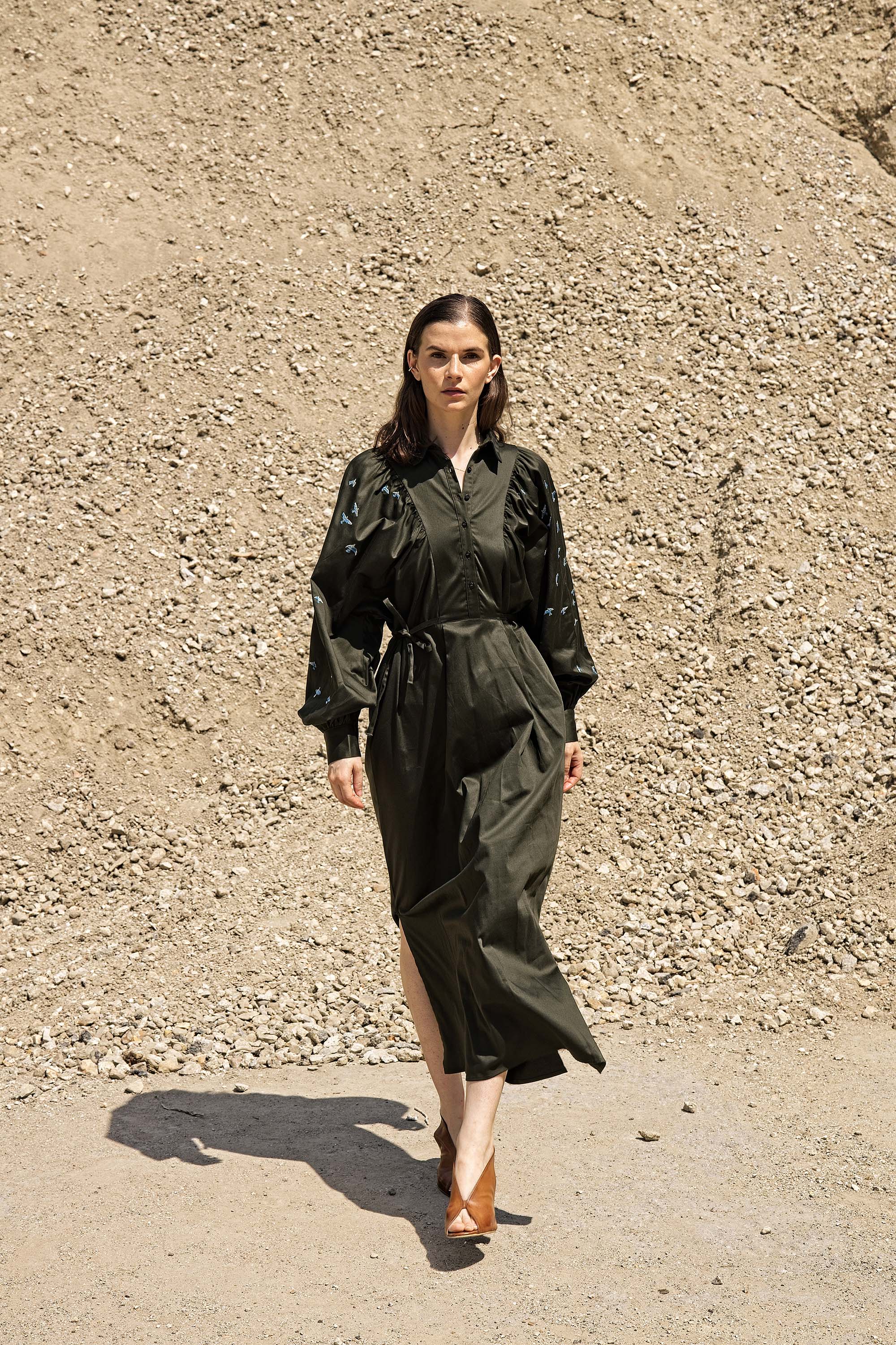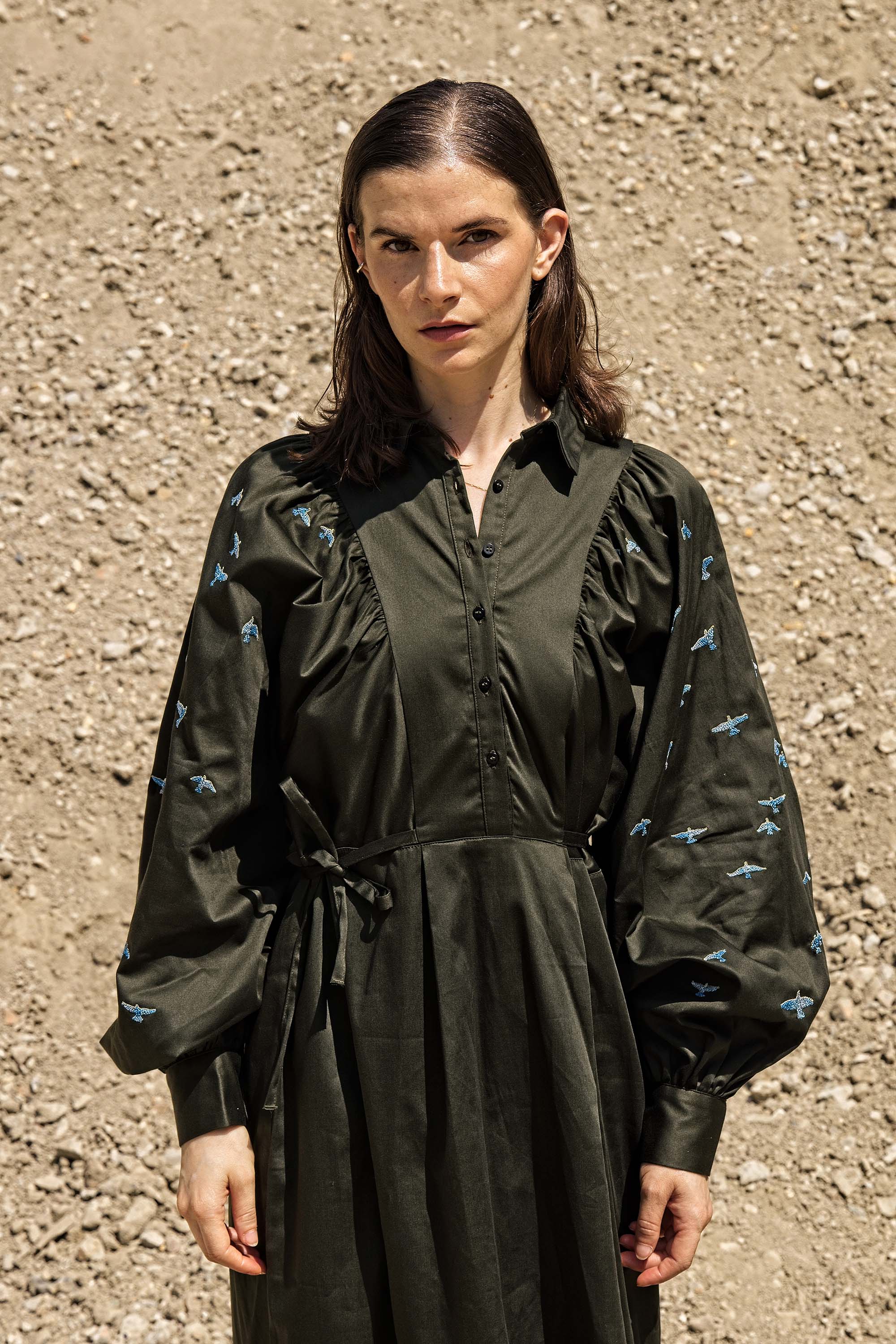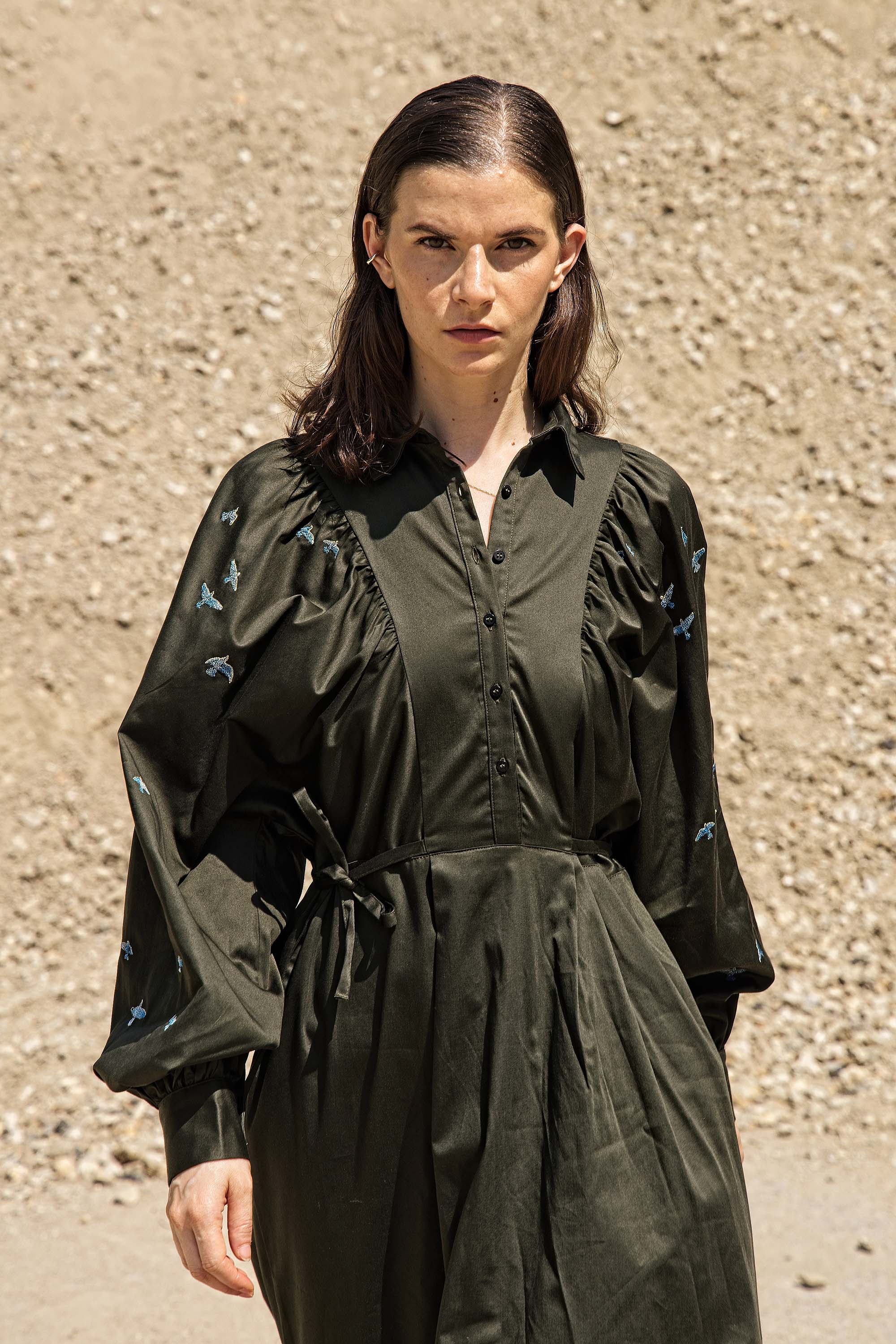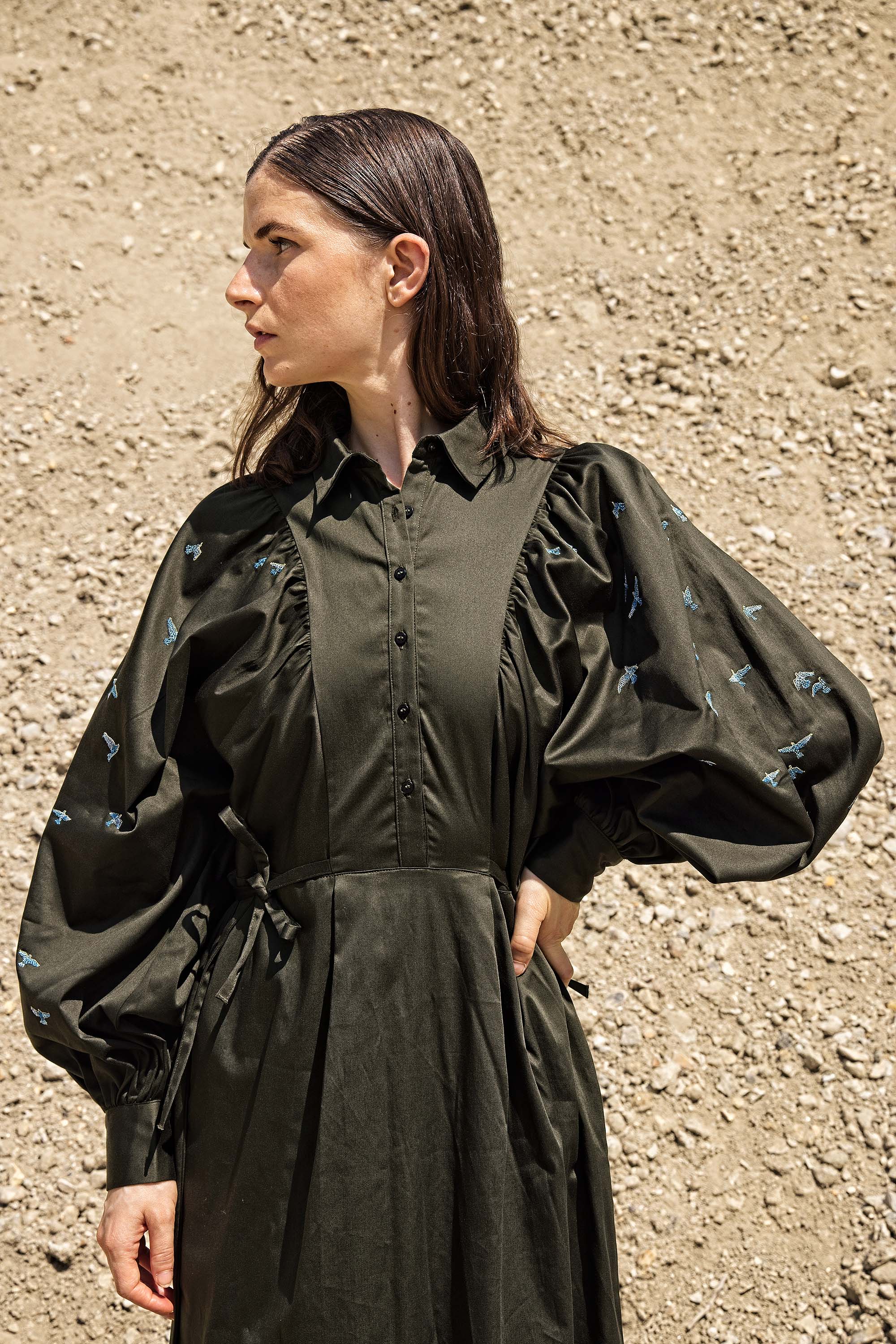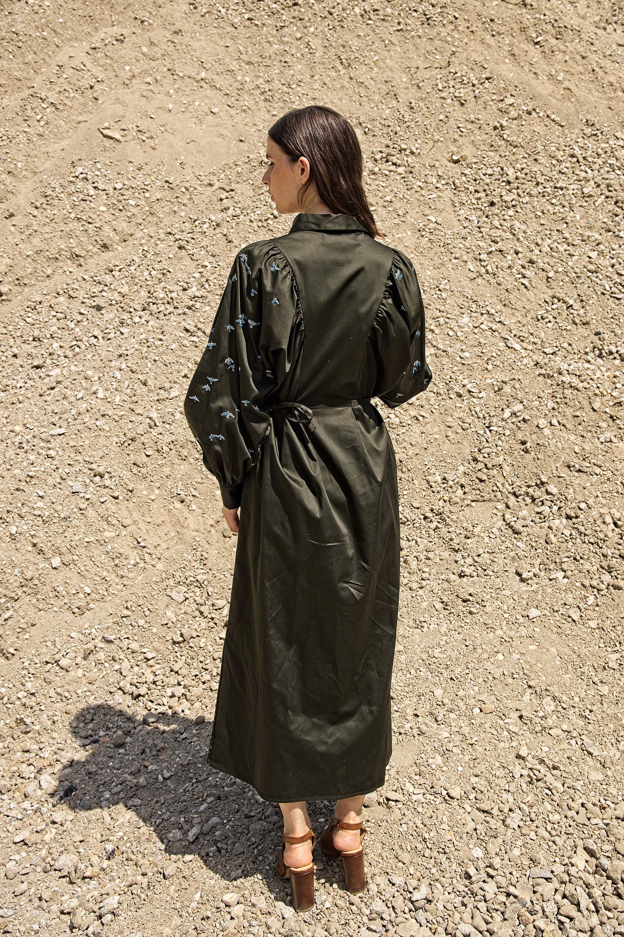 KHAKI DRESS WITH BALLOON SLEEVES AND BIRD EMBROIDERY