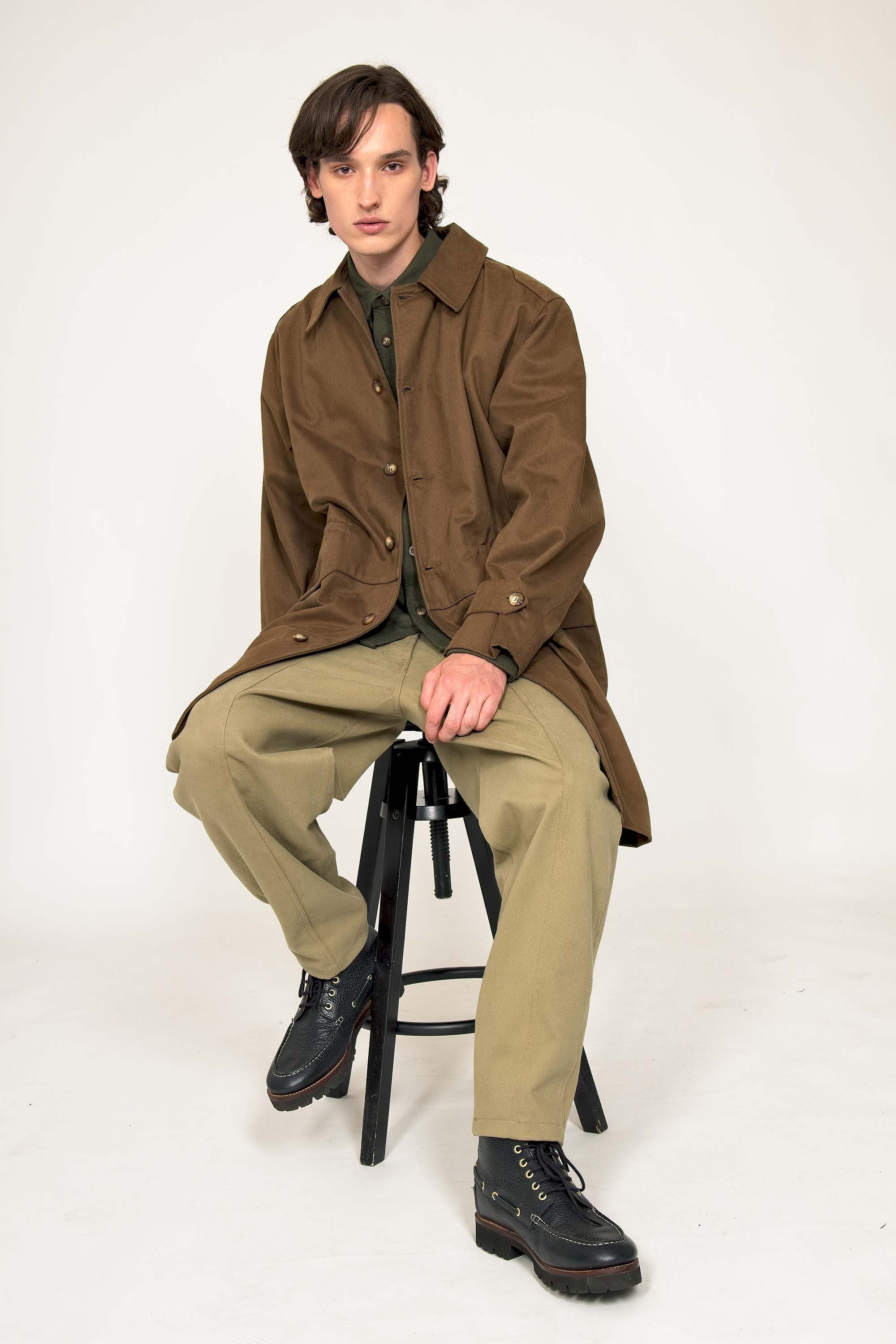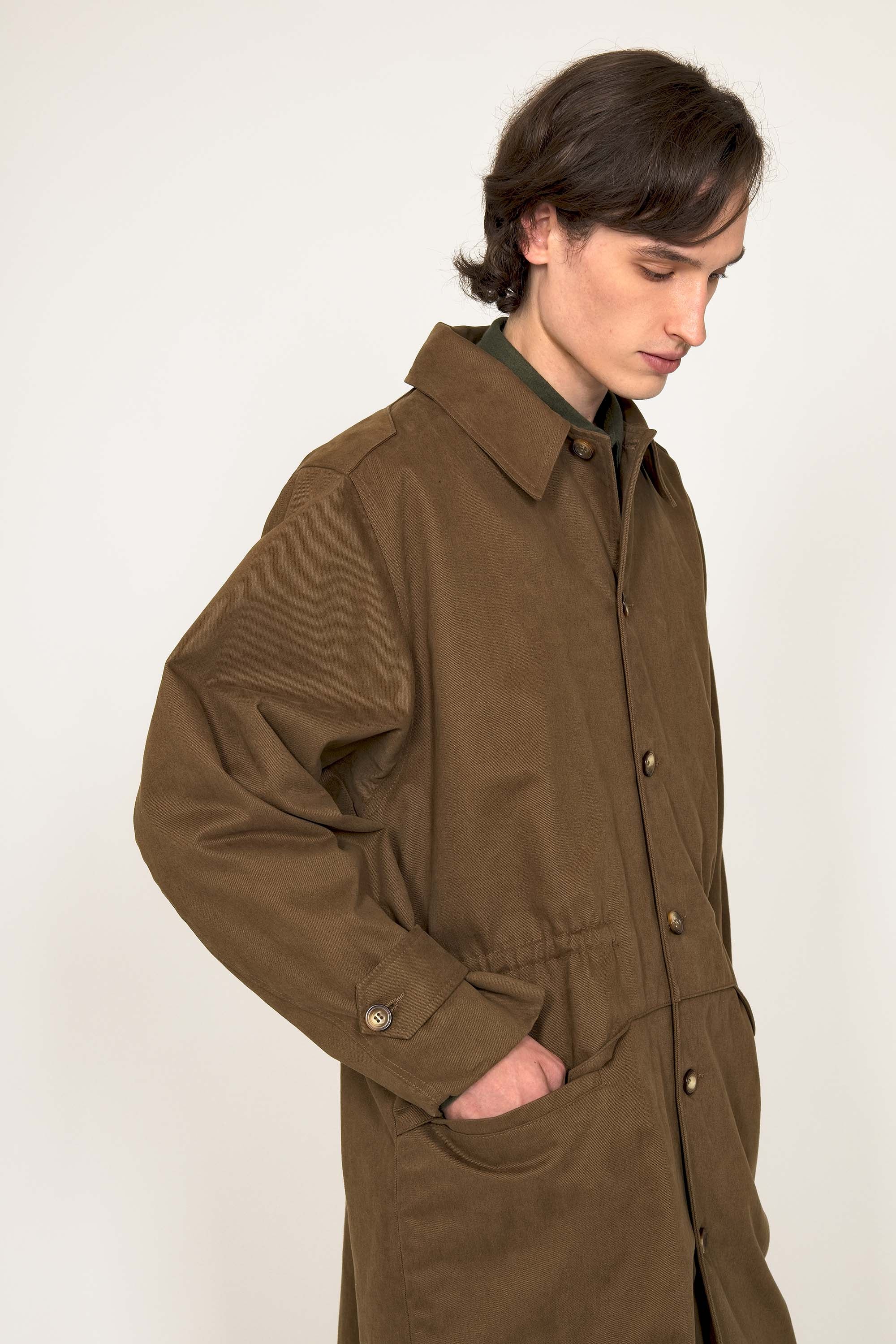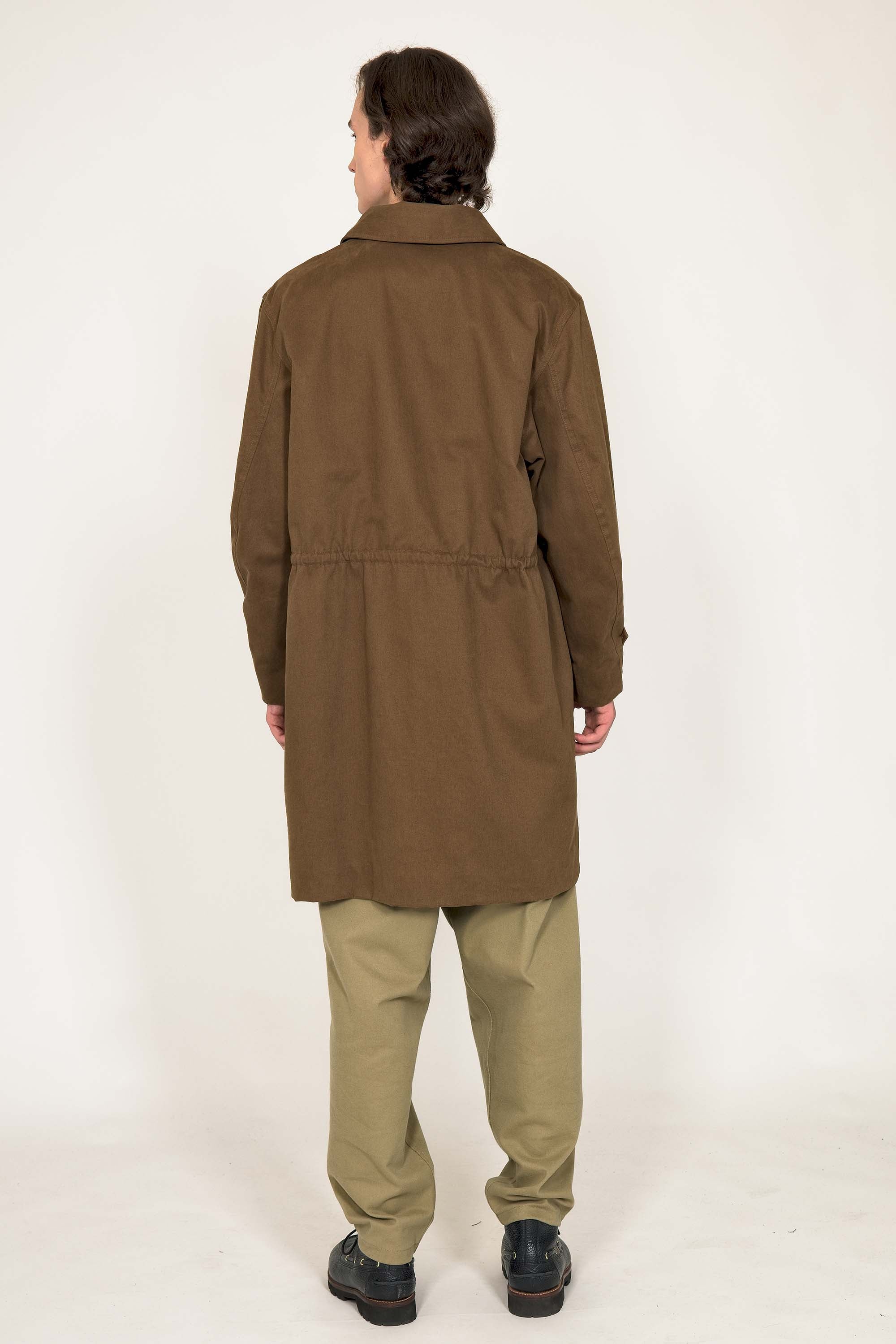 LONG COAT IN MILITARY PARKA STYLE IN BRONZE COTTON WITH RED LINING